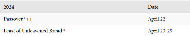 With Passover starting on a Monday. The New Moon for April is on the 8th. So if we want to observe the festivals, we need to go to the 14th day after the New Moon, which is (8th April + 14 days = 22 April), which is how we arrive on 22nd April in the graphic above.